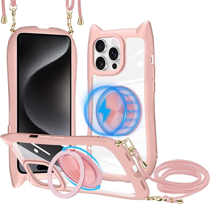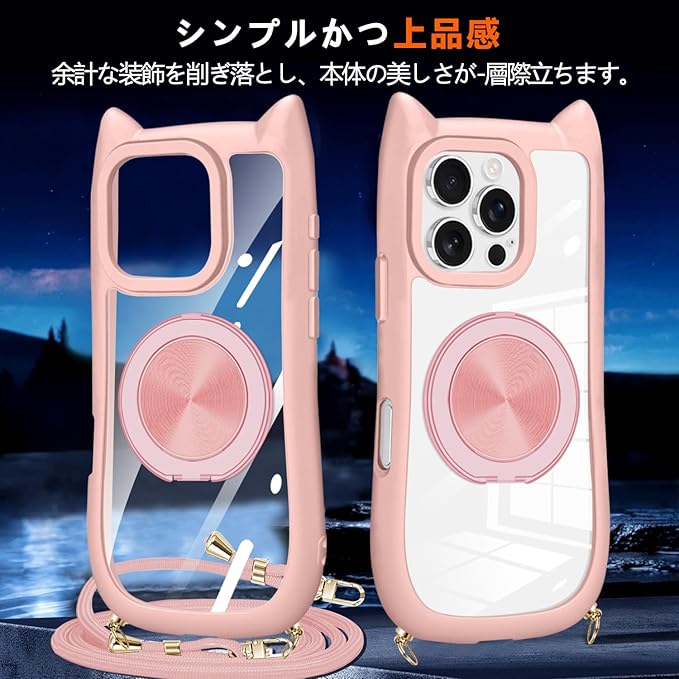 iPhone 15 Pro Max 用 ケース クリア MagSafe対応 360度回転スタンド リング付き PC背面 + TPUバンパー ワイヤレス充電 ネック ショルダー あいほん15 Pro Max カバー 肩掛け 首掛け 斜めがけ 紐付き 韓国 かわいいファッション 耐衝撃 米軍MIL規格取得 落下防止 薄型 軽量 黄変なし車載対応 アイフォン15 Pro Max スマホケース