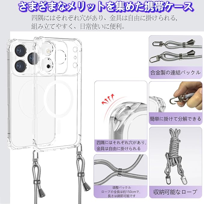 ケース 用の iPhone 17 Pro Max クリア ショルダー カバー 肩掛け 斜めかけ 縄掛けケース 透明 TPU 携帯ケース 紐付き 織りストラップ付き 長さ調整可能 取り外し可能 紛失防止 落下防止 ワイヤレス充電対応(シルバー)