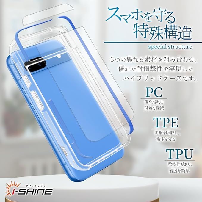 【3種類の素材を使用】ケースの背面はPC(ポリカーボネート) , TPU(熱可塑性ポリウレタン) , TPE(熱可塑性エラストマー)を使用し、耐衝撃性と耐傷性を追求しております。