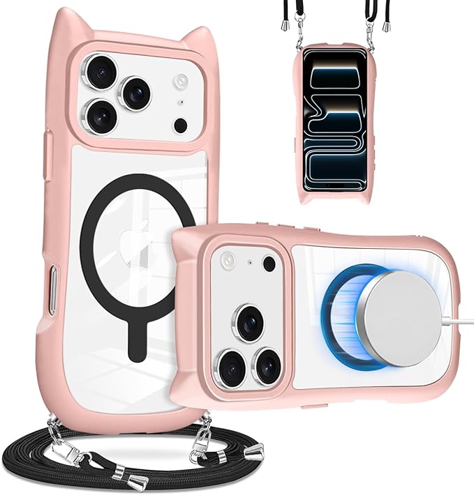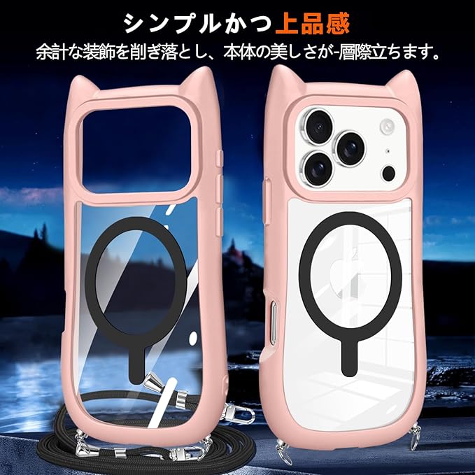 iPhone 17 Pro Max ケース MagSafe対応 猫耳 TPU ストラップ穴付き ショルダー 肩掛け 縄掛け 紐付き 斜めがけ ストラップ着脱可 いphone 17 pro max スマホケース 韓国 おしゃれ 可愛い クリア 指紋防止 耐衝撃 滑り止め 全面保護
