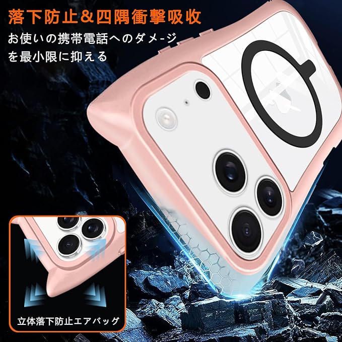 【コーナー強化防護 高耐落下性能】4 カ所のコーナーに専用防護構造を搭載し、内層に高弾性の衝撃吸収素材を使用しています。落下時に発生する衝撃を多段階で緩和し、スマホ本体、スクリーン及びカメラを効果的に保護します。
