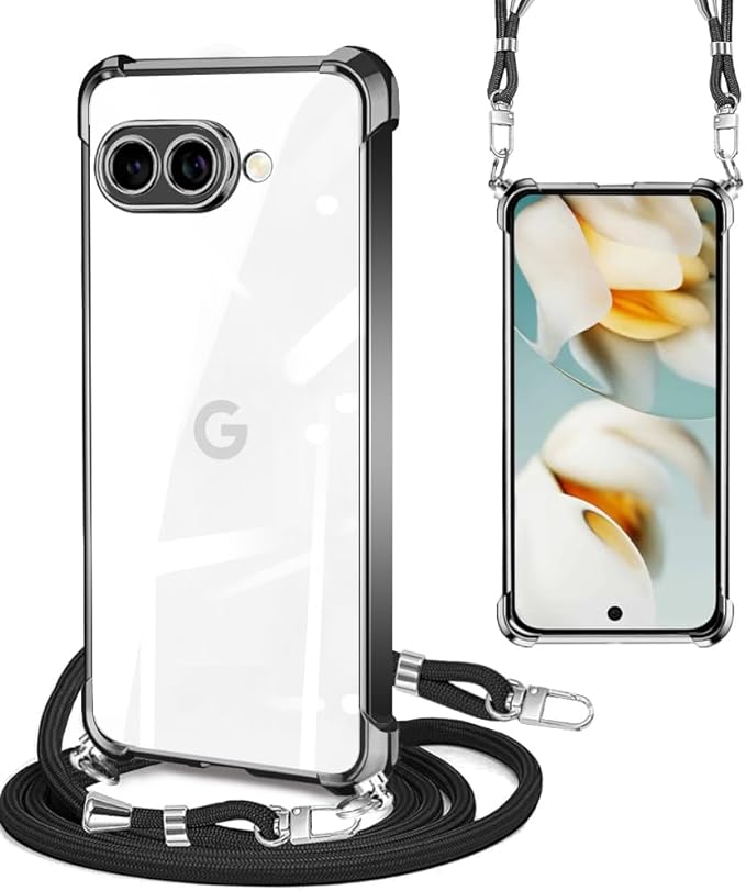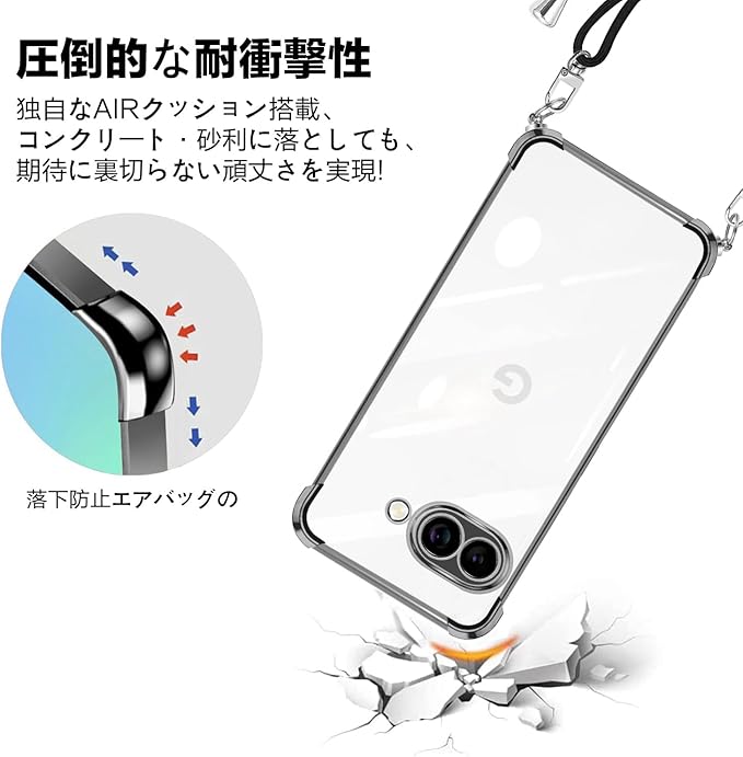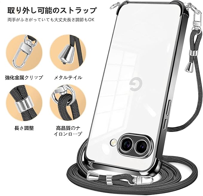 Google 用の Pixel 9a ケース クリア ショルダー耐衝撃 TPU ストラップ ピクセル 9a スマホケース 用の Pixel 9a カバー サムスン 肩掛け 斜めかけ 縄掛け 透明 ストラップ付き 薄型 軽量 紐付き 取り外し可能 携帯ケース(ブラック
