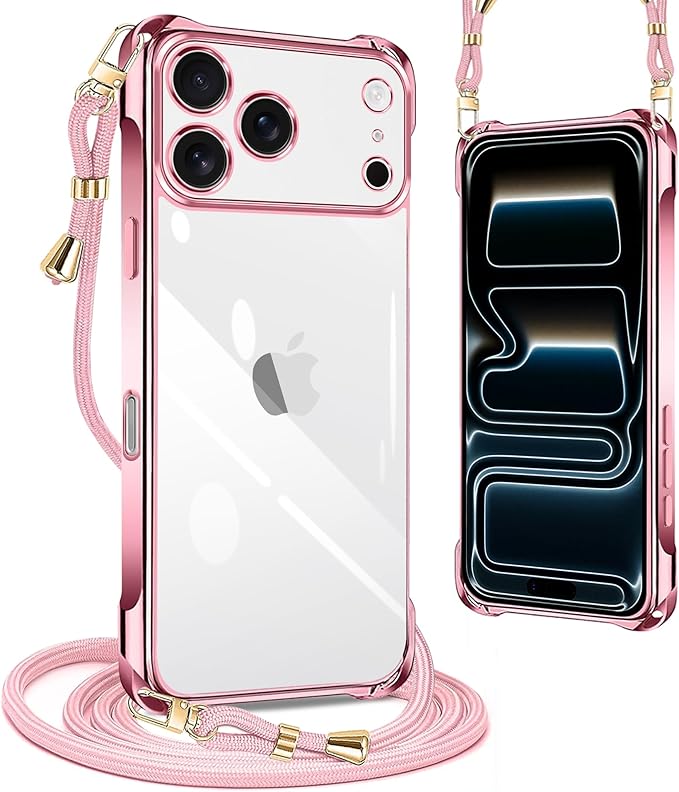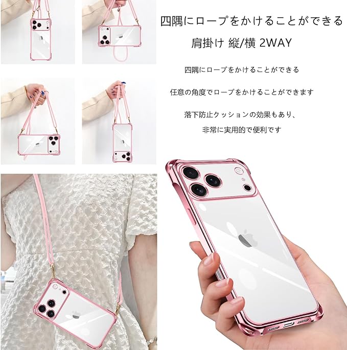 iphone 17 pro max 用の ケース 2025年発売 クリア ネック ショルダー いphone 17 pro max ケース 耐衝撃 ストラップ付き アイフォン17 pro max カバー 透明 TPU スマホ シリコン カバー 紐付き 斜めがけ 織りストラップ付き 肩掛け 縦/横 2WAY 調節可能な クロスボディ 多目的キャリー(ローズゴールド)