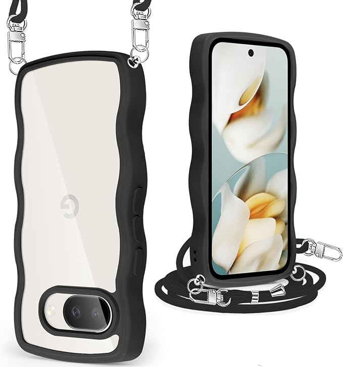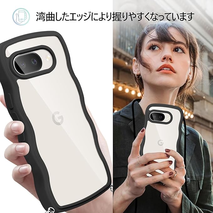 Google Pixel 9A ケース クリア ショルダー グーグル ピクセル9a カバー うねうね 透明 人気 かわいい 耐衝撃 スマホケース ストラップ付き 取り外し可能 長さ調整可能 首かけ 肩掛け 薄型 軽量 TPU ワイヤレス充電対応(ブラック)