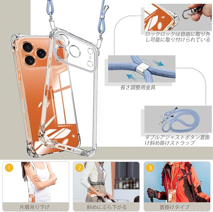 iPhone 17 pro max ケース クリア 用の ショルダー 耐衝撃 アイフォン17 promax 対応カバー 調節可能 クロスボディネックレス 保護ソフトTPU iphone 17 pro maxカバー 軽量 肩がけ 首掛け 紐付きバンパー ストラップ付き 透明 着脱可調節 全面保護 Qi充電 ワイヤレス充電 落下防止 すり傷防止 カメラ保護【縄掛け-アッシュブルー】