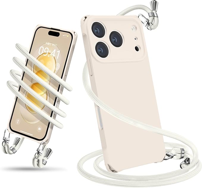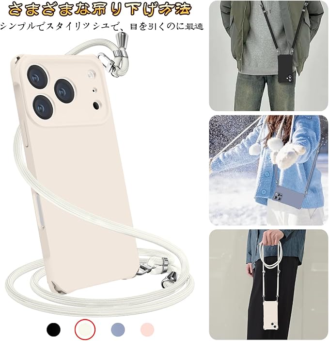 用の iPhone 17 Pro Max ケース ショルダー シリコン カバー 耐衝撃 肩掛け 斜めかけ 縄掛けケース 薄型 軽量 紐付き 織りストラップ付き ネックストラップ 長さ調整可能 取り外し可能(ホワイト)