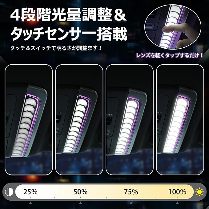4.【タッチセンサ一&左右独立調整】:タッチセンサ一が搭載されて、ランプの中央周りをタッチすることで、明るさ調整とOFF操作ができます。左右独立調整で同乗者を配慮しながら必要な場所だけを照らすことができます!