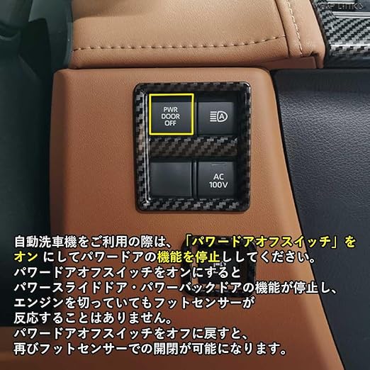 【ご注意ください】 自動洗車機をご利用の際は、「パワードアオフスイッチ」をオン にしてパワードアの機能を停止ししてください。 パワードアオフスイッチをオンにするとパワースライドドア・パワーバックドアの機能が停止し、エンジンを切っていてもフットセンサーが反応することはありません。 パワードアオフスイッチをオフに戻すと、再びフットセンサーでの開閉が可能になります。 パワードアオフスイッチが見つからない場合は、エンジンをかけたままにするか、エンジンを切る場合はロックをかけてスマートキーを車が反応しない位置まで離してください。