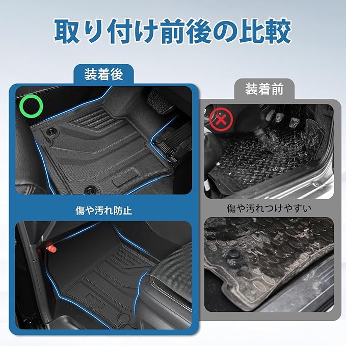 5.【簡単装着】被せるだけ!女性の方でも簡単装着!【抗菌性・耐磨耗性】抗菌性・消臭性・防汚性・耐磨耗性に優れたフロアマットは雨降りや悪天候の時に車内の汚れを気にせず重宝します。暑い日にも寒い日にも耐えられますので、マリーンスポーツ、ウィンタースポーツなどを楽しむ方へ、いつでも快適ドライブが楽しめる~