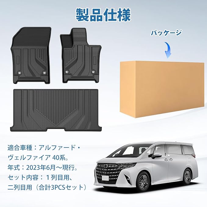 1.【適合車種】トヨタ アルファード・ヴェルファイア 40系。型式:AGH45W/AGH40W/AAHH40W/AAHH45W。年式:2023年6月~現行((令和5年6月~現行)。※7人乗り、ガソリン、ハイブリッド車対応。【セット内容】運転席用1p、助手席用1p、二列目用1p(合計3Pセット)。※購入する前、形状、年式とモデルを確認してください。※注意事項※:製品包装が折りたたみ式で梱包されているため、到着後にお湯やドライヤーなどで暖めれば元の状態に戻ります。※