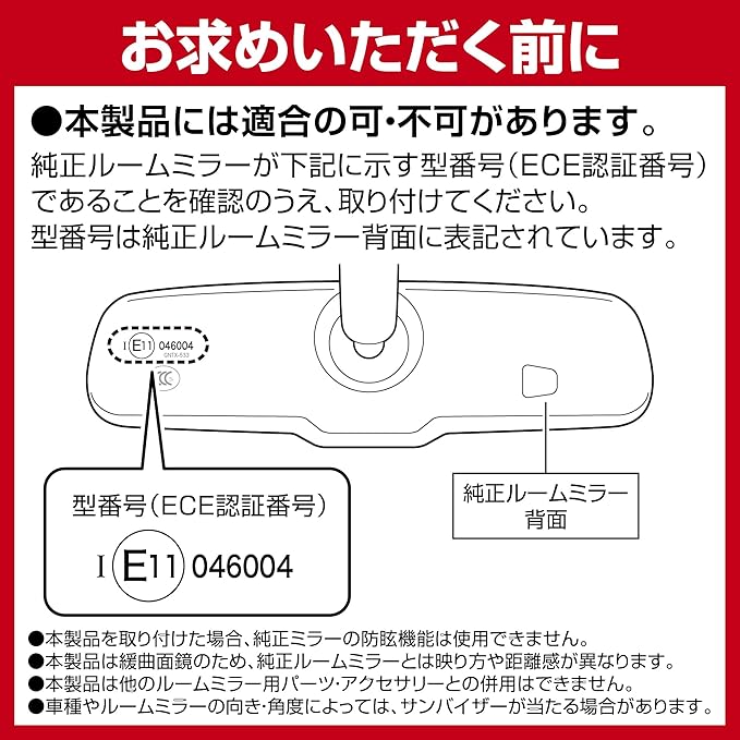 【お求めいただく前に】 ・本製品には適合の可・不可があります。純正ルームミラーが下記に示す型番号(ECE認証番号)であることを確認のうえ、取り付けてください。 型番号は純正ルームミラー背面に記載されています。 型番号(ECE認証番): I (E11) 046004 ・本製品を取り付けた場合、純正ミラーの防眩機能は使用できません。 ・本製品は緩曲面鏡のため、純正ルームミラーとは映り方や距離感が異なります。 ・本製品は他のルームミラー用パーツ・アクセサリーとの併用はできません。 ・車種やルームミラーの向き・角度によっては、サンバイザーが当たる場合があります。