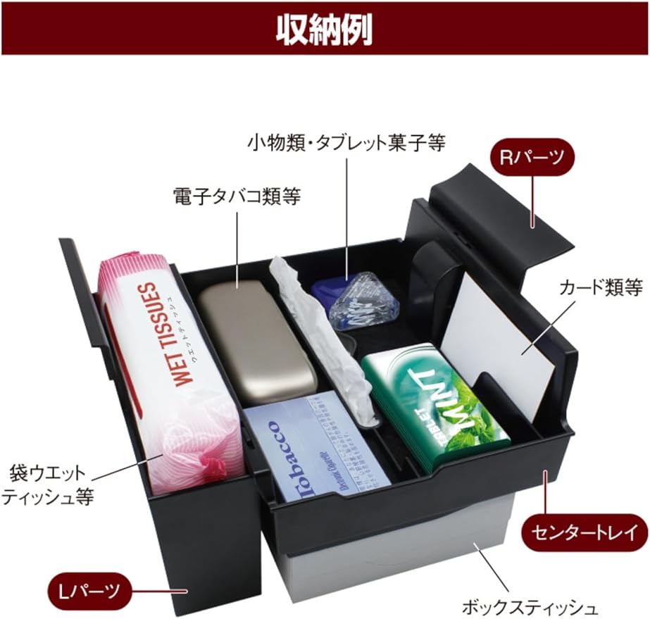 SY-AV8 40系 アルヴェル専用 サイドBOXゴミ箱プラス 運転席用 商品説明 40系アルファード・ヴェルファイア(AAHH4#/AGH4#/TAHA4#)右ハンドル車の運転席側フロントドアポケット専用のゴミ箱&折りたたみ式ハンディーモップ(専用ケース付き)です 専用設計で、運転席側フロントドアポケットにピッタリフィットします 運転席側フロントドアポケットに入れるだけの簡単取り付けです フタを押すと開き、フタを閉じて押すとロックする構造で、簡単に開閉することができます フタにはダンパーを採用し、スムーズな動きで開きます たまったゴミは本製品のゴミ箱を上下分割して捨てることができます ホコリをしっかりキャッチする極細繊維のハンディーモップを付属しています 内装に合わせた革シボ調です ゴミ箱の容量は約1.3Lです 調査日(2023年5月現在)以降のマイナーチェンジ車には適合しない場合があります 運転席側フロントドアポケットに追加オプションが装着されている車両へは取り付けできません SY-AV10 40系 アルヴェル専用 コンソールボックスインナートレイ 商品説明 40系アルファード・ヴェルファイア(AAHH4#/AGH4#/TAHA4#)右ハンドル車のコンソールボックス専用のトレイです 専用設計で、コンソールボックスにピッタリフィットします 両面テープで貼り付けてセットするだけの簡単装着です スマートフォンや財布等の小物を手軽に置けます 収納物が傷付かないクッション付きです センタートレイ裏側にボックスティッシュをベルトでセットできますボックスティッシュの取り替えはベルトを調節するだけで簡単に行なえます 内装に合わせたシボ調です 調査日(2023年5月現在)以降のマイナーチェンジ車には適合しない場合があります コンソールボックスに追加オプションが装着されている車両へは取り付けできません 収納物によっては、コンソールボックス内の電源等が使用できなくなる場合があります 本製品は下記の条件を満たすボックスティッシュに対応します 袋入りタイプのティッシュには対応しません