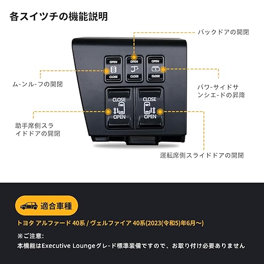 【取付動画で簡単】新登場 CyVaJive アルファード40系 ヴェルファイア 40系 専用 運転席増設スイッチキット 5ボタン集中制御 LEDバックライトで夜間も見やすい 電動スライドドア/テールゲート/ムーンルーフ/サンシェード 自動開閉・一時停止 カプラーオン 実車テスト済 純正交換対応 (Alphard Vellfire 40 R5.6~)