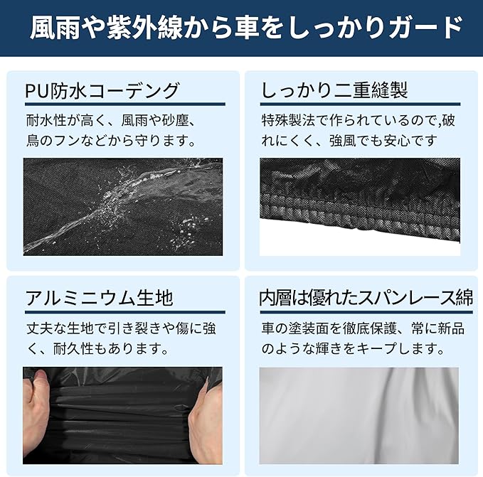 【耐久性】愛車のボディをしっかりとガードします。駐車時の雨や鳥の糞、霧、ホコリ、大気中のガスなどから、効果的に保護します。梅雨の湿気や酸性雨による車体の劣化を防ぎ、直射日光からの紫外線による塗装の変色や、太陽光によるダッシュボードの変形を防止します。カバーは耐久性に優れ、清掃も簡単です。