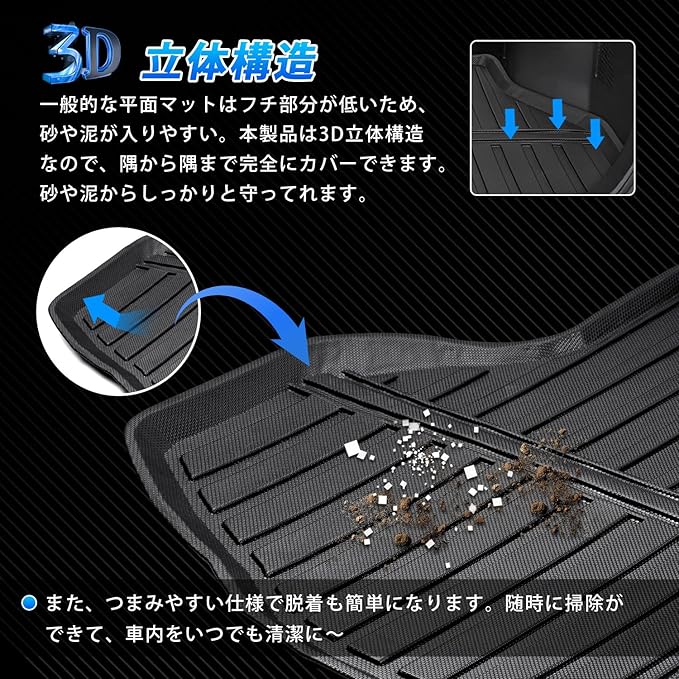 4.【3D立体構造】一般的な布製の平面トランクマットではフチ部分が低いため、砂が入りやすい!本製品は3D立体構造なので、隅から隅まで完全にカバーできます。砂や汚れからしっかりと守ってれます。いつでも車内の清潔が保ちます。