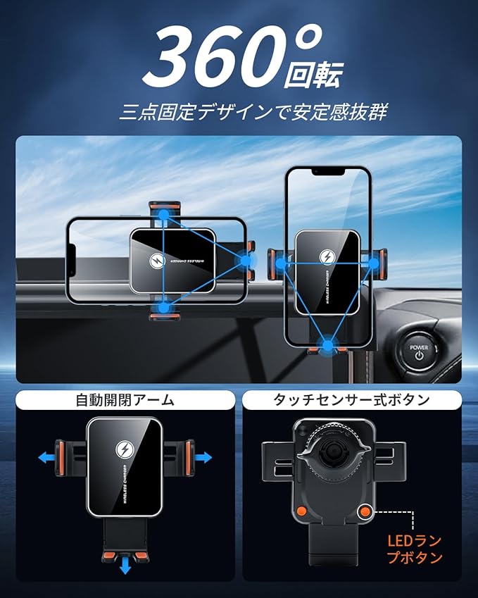 【360 自由回転&角度調整可能】アルファード40ワイヤレス充電器には高精度ボールジョイントを採用し、360 自由回転の角度微調整に対応。運転席からの視野やエアコンの位置に合わせて、最も見やすい角度に調整できます。走行中の振動にも強い安定設計で、スマホをしっかり固定。