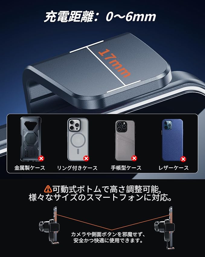 【Qi規格に対応・最大15W】国際標準のQi規格に対応し、スマートフォンを置くだけで自動的に充電が開始されます。最大15Wの高出力で、従来品よりもスピーディーかつ安定した充電が可能。 過電流保護・過電圧保護・短絡保護などの安全機能を搭載し、長時間の使用でも安心です。iPhone12以降のシリーズ、Samsung Galaxy、Sony XperiaなどQi対応スマートフォンに幅広く対応します。