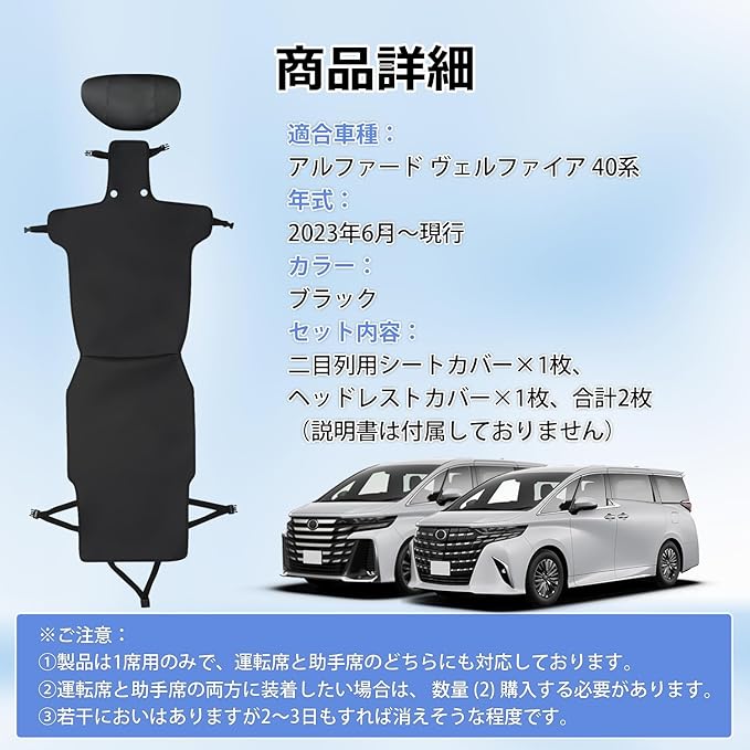 1.【適合車種】:アルファード ヴェルファイア 40系に適用。【年式】:2023年6月~現行。【セット内容】:二目列用シートカバー 1枚、ヘッドレストカバー 1枚、合計2枚、二目列1席用。※ご注意:①この製品は1席用のみで、運転席と助手席のどちらにも対応しており、画像のように運転席と助手席の両方に装着したい場合は、 数量 (2) 購入する必要があります。②商品は巻いて発送するため、裏面の接着面に色移りが生じる場合がございます。使用には問題ありませんが、ご購入前に十分ご検討ください。