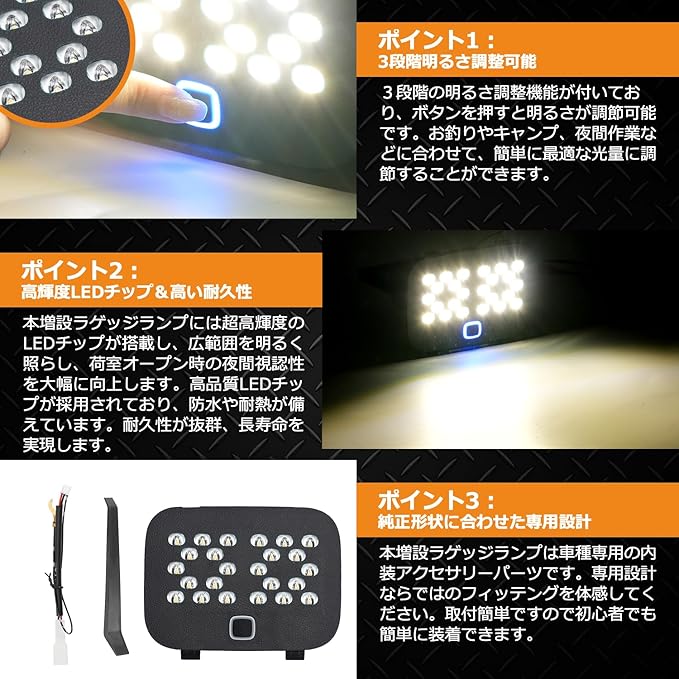 【高輝度&3段階明るさ調整可能】本LEDラゲッジランプは超高輝度のLEDチップが搭載し、広範囲を明るく照らし、荷室オープン時の夜間視認性を大幅に向上します!3段階明るさ調整でき、ボタンを一回押すと明るさが調節可能です。お釣りやキャンプ、夜間作業などに合わせて、簡単に最適な光量に調節することができます。
