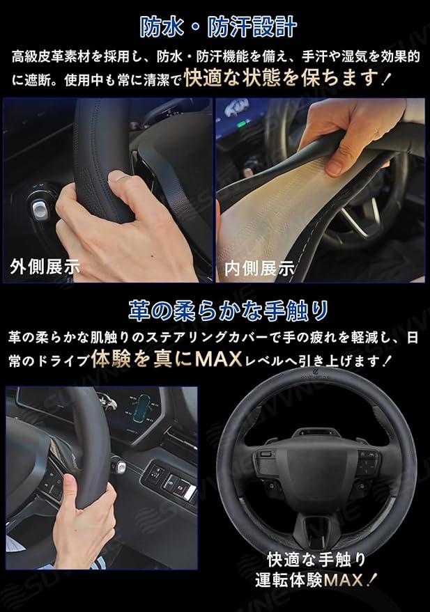 【簡単取り付け】特別な工具や専門知識は一切不要です。1.取り付けは、中央のロゴマークを合わせる 。2. ハンドル上部から被せていく 。3. 途中でセンター位置を調整しながら嵌め込む 。4. ステアリングの下側を引き上げながら、最後までしっかり押し込んで完成します。長期間のご使用にもご安心いただける耐久性で、安全かつ快適なドライブを実現します。
