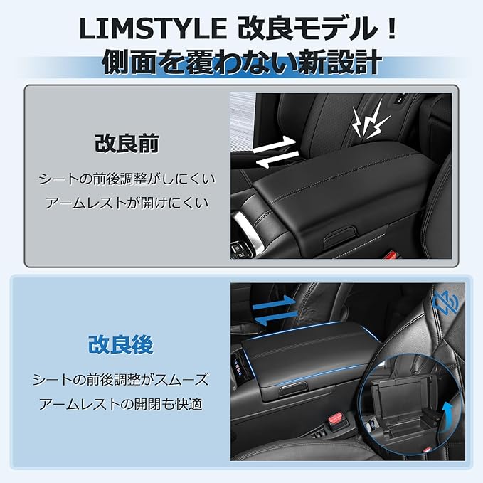 2.【LIMSTYLE 改良新作】:側面まで覆う仕様ではなく、必要な部分のみをカバーする設計に改良。運転席・助手席のシートに擦れにくく、シートの前後調整やアームレスト開閉にも影響しません。