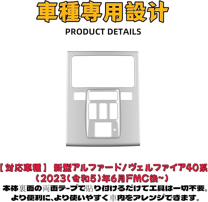 本品は、2023年6月以降に生産されたアルファード ヴェルファイア 40系専用に設計された商品です。環境に優しいABS素材を使用し、安全で無毒、耐熱性・耐寒性に優れ、防水・絶縁性も備えており、長期間ご使用いただけます。実車のデータに基づいて設計されているため、元のカップホルダーに完璧にフィットし、既存の機能を妨げることなく、車内の質感を向上させます。取り付けは簡単で、工具不要で、取り付け面を清掃し、裏面の両面テープを剥がすだけでしっかり固定可能。シンプルで洗練されたデザインと高品質な仕上げが高級感を演出し、車内のインテリアと調和して、車全体の格調を高めます。