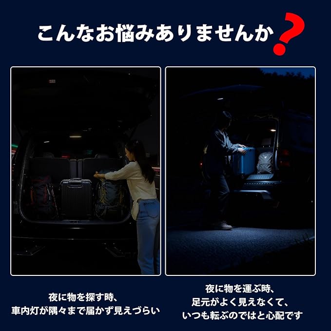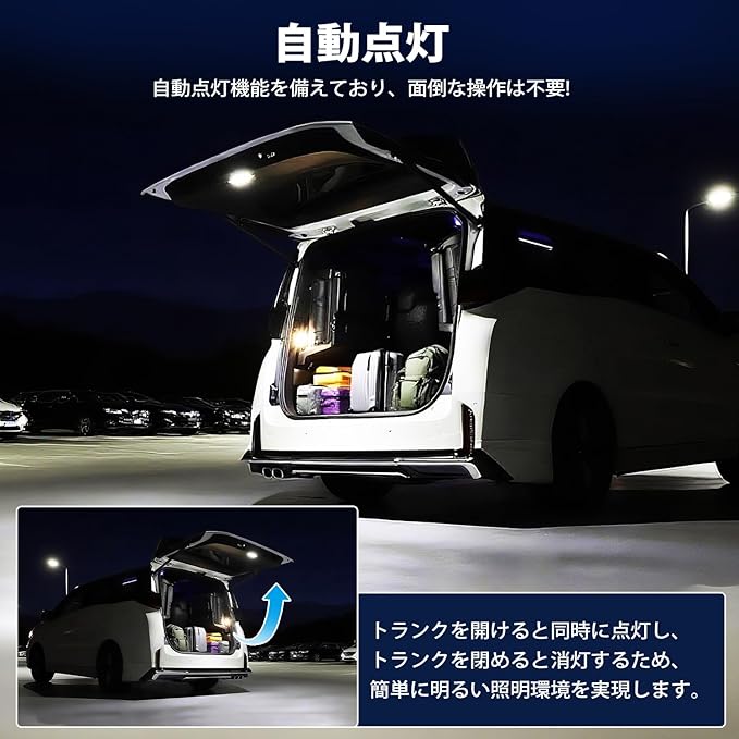 2.【高輝度白光・自動点滅】:本製品は高輝度のLEDチップを搭載しており、広範囲を明るく照らすため、夜間の荷物の積み下ろしや整理、物探しにもくっきりとした視界を提供します。さらに、自動点灯機能を備えており、面倒な操作は不要です。トランクを開けると同時に点灯し、トランクを閉めると消灯するため、簡単に明るい照明環境を実現します。