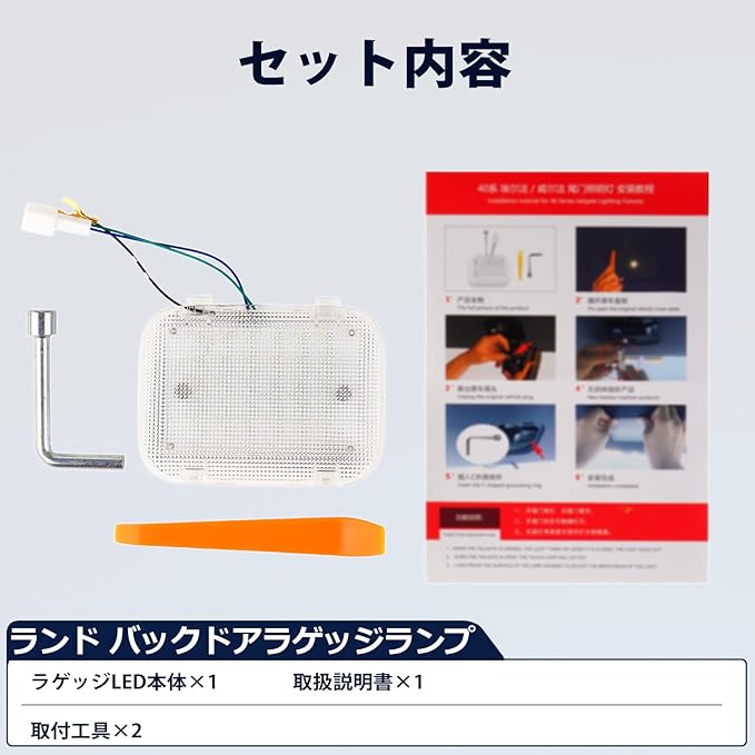 1.【適合車種】:アルファード ヴェルファイア 40系。適合年份:2023年6月~現行。※注意事項:製品画像とお車をご確認頂き、お買い求め下さい。【セット内容】:ラゲッジLED本体 1、取扱説明書 1、取付工具 2。
