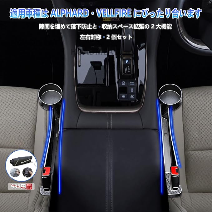 【アルファード・ヴェルファイア にぴったり!】アルファード・ヴェルファイア 40系 30系 の車内隙間収納クッションです。運転席と助手席にそれぞれ 1 個ずつ、計 2 個付属しています。 車内の隙間から小物が落ちるのを徹底解消! コイン、車の鍵、スマホ、イヤホン、クレジットカードなど、日常的に使う小物の落下を確実に防ぎ、屈んで拾う手間や拾いにくいトラブルを完全回避できます。 さらに、「隙間埋め防止」と「収納スペース拡張」の 2 大機能を兼ね備えています。 無駄な隙間を有効活用して収納スペースを効率的に増やし、車内をスッキリ整理することが可能です。