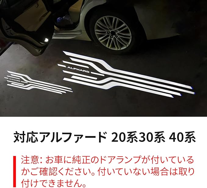 【専用設計】 トヨタアルファード20系 30系 40系 専用設計のドアカーテシライトで、車のドアを開けるたびに鮮やかなロゴが足元に投影され、高級感と個性を演出します。対応モデル多数、詳細は商品説明をご確認ください。