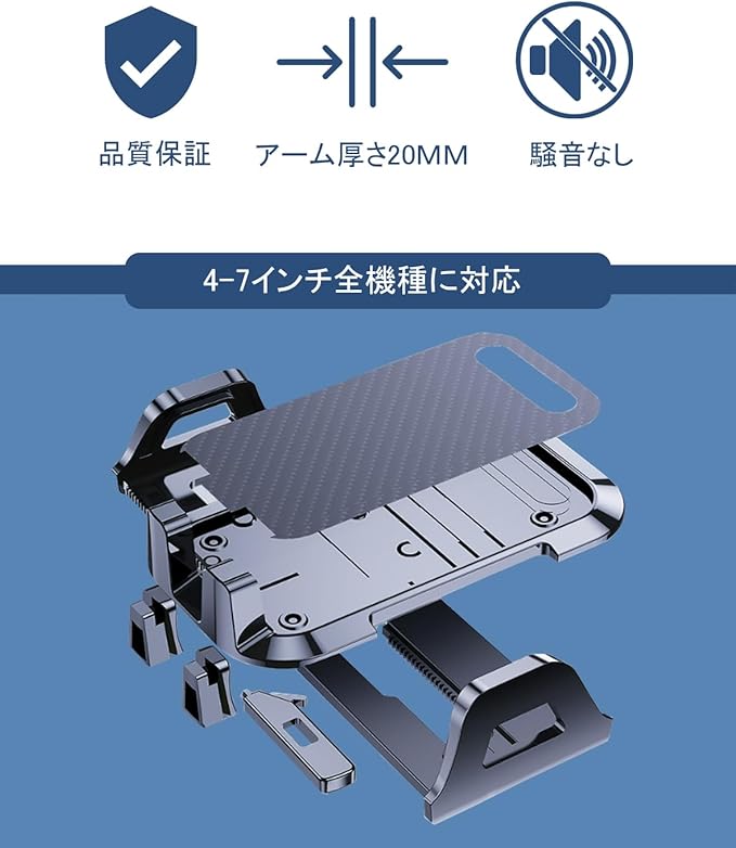 【高いホールド力】アームの内側はゴムが付いているので滑り落ちず、スマホも傷付きません。またホールドもがっちり安定していて、悪路を走行中でもスマホがずれ落ちる不安なしです。