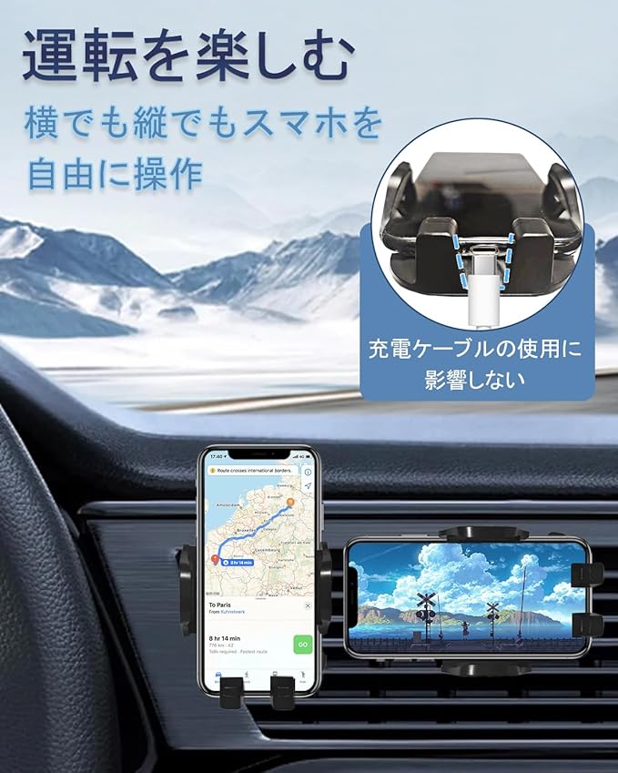 【横置きタイプ】360度回転できるボールジョイントを利用して、横向きでも安定です。縦向きでナビとして使用しても、横向きで動画を視聴しても実現できます。