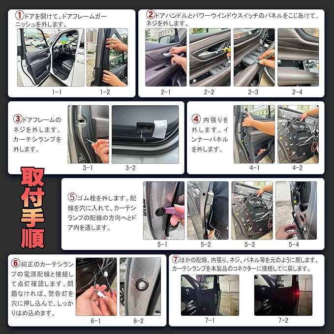 【対応車種】アルファード ヴェルファイア 40系、全グレード対応、R5.6~現行。カーテシ無し車は取付不可。セット内容:LEDドア追突防止警告灯 2、内張り剥がし 1。※取付説明書はございません。商品画像の取付手順をご参考にお取り付けください。予めご了承お願いします。※年式・グレード・オプション等により適合しない場合が御座います、よく製品形状とお車をご確認頂き、お買い求め下さい。発光色:レッド、発光パターン:点滅。