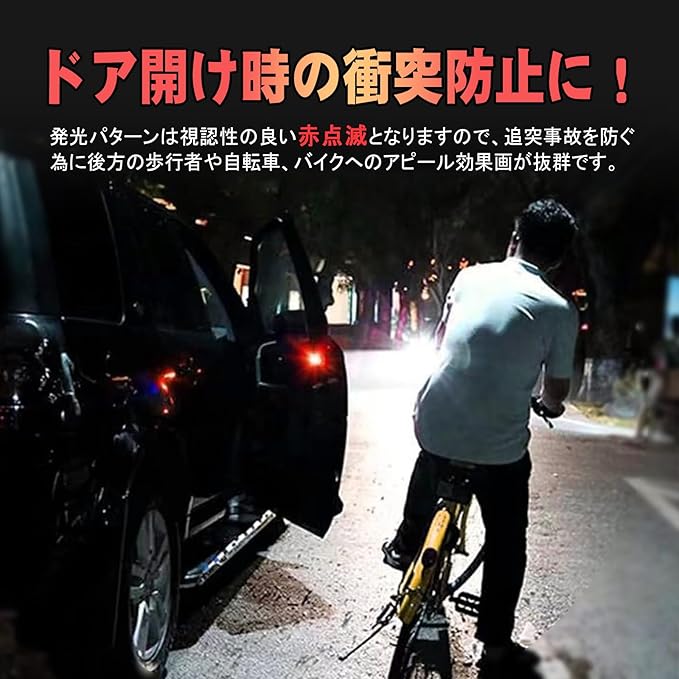 【ドア開け時の衝突防止に】発光パターンは視認性の良い赤点滅となりますので、追突事故を防ぐ為に後方の歩行者や自転車、バイクへのアピール効果画が抜群です。