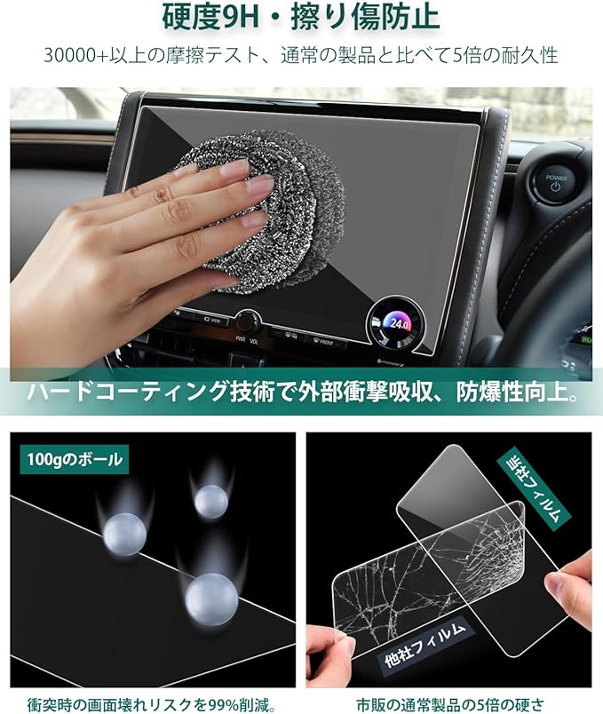 【高透過率・指紋や汚れ軽減】96%以上驚きの透過率をもち、液晶画面を守りながらスクリーン元々の鮮やかな画質を損なわなく、そのままに楽しみます。フィルムの表面に撥水撥油防汚機能があるため、指紋や汚れが付着しにくくなり、日常のディスプレイオーディオの使用中、指紋や汚れの跡が画面に付着した場合にも、湿らせたペーパータオルで簡単に拭き取ることができます