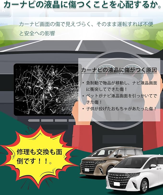 【車種専用の車内液晶画面保護が必要】昨今の自動車の液晶画面の操作が多くなっています、そのため傷や指紋、汚れが気になることでしょう。それで、液晶画面に保護フィルムを貼ったほうが、画面保護にとてもいい対策かと思います。車種専用設計のフィルムはアルファード40 の後席 ディスプレイと、ナビの精確なデータに基づいて作られたので、サイズの事が心配必要ないし、液晶画面を傷から守ると同時に、指紋や汚れが直接オリジナル画面に付くことも防止できます。傷はつかないし、指紋も気になった時に拭けばいいです。
