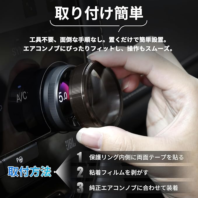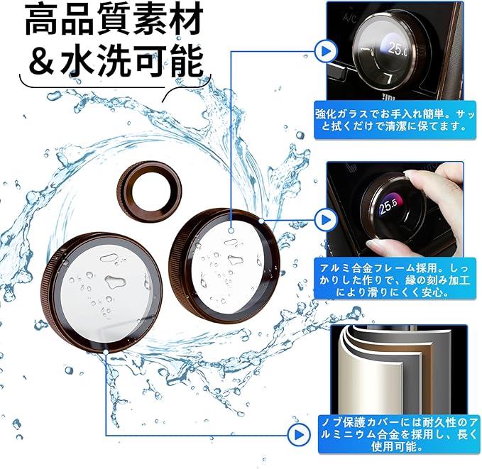 【強化ガラス素材でしっかり保護】高硬度の強化ガラスを採用し、エアコン操作ノブを日常使用によるキズ・汚れ・指紋・摩耗からしっかり保護しま高透明で操作性を損なわない透明度の高いガラス素材により、表示が見やすく、視認性はそのまま。装着後も回転操作がスムーズで、純正ノブ本来の操作感を維持します。す。頻繁に触れる部分だからこそ、劣化を防ぎ、美しい状態を長期間キープできます。