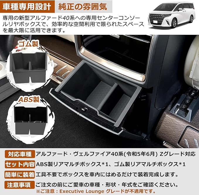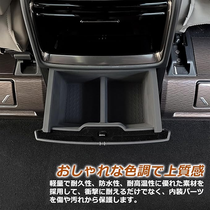 【簡単に取付】:アルファード/ヴェルファイア 40系車種専用の設計で、ツールは一切必要なし、ボックスを車内にはめるだけで装着完成します。工具不要で脱着も簡単です。機能性だけでなくデザイン性にも優れており、車内のカスタマイズを考えている方には特におすすめです。セット内容:ABS製リアマルチボックス本体*1、ゴム製リアマルチボックス本体*1