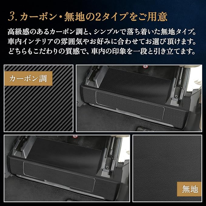 【選べる質感で車内をグレードアップ】高級感を演出したい方にはカーボン調、落ち着いた印象を求める方には無地タイプをご用意。どちらも質感にこだわり、車内の雰囲気に自然と馴染みます。インテリアのテイストや好みに合わせて選べるので、自分らしい車内空間を演出可能。ワンランク上のカスタムにも◎。