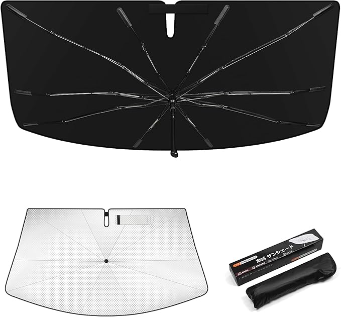【最新改良・特殊なコーティング素材】耐久性と機能性を両立した便利な折りたたみ傘式サンシェードが登場!厚いシルバーコーティングとナノ複合素材を使用し、日差しの強い日も太陽光を通さずにカットし、直射日光による車内の温度上昇を抑えることができます。表はシンプルな銀ドット柄で、見た目も美しく、断熱効果も抜群です。裏は黒いコーティングで眩しさを軽減し、優れたUVカット効果を発揮します。夏のドライブを快適にサポートします。