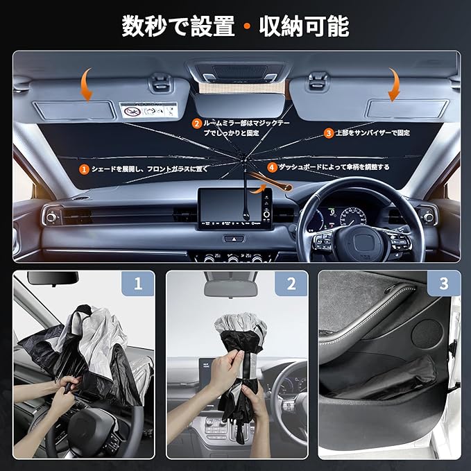 【車種専用】アルファード/ヴェルファイア 40系専用に設計なのでフロントガラスをぴったりと覆います。より快適なプライベート空間を作り出します。【設置・収納の手軽さ】傘を開くようにパッと広げて、ルームミラー部はマジックテープでしっかりと固定、サンバイザーで挟むだけで完了します。女性でも簡単に取り付けます。折りたたみ式なので、ドアポケットやシートバックポケットにもスッと収まます。