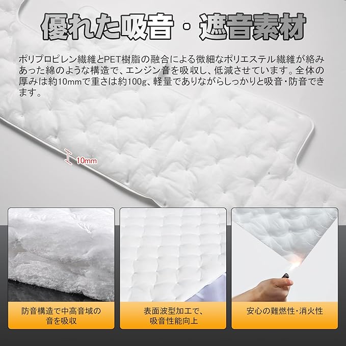 【高品質材質】ポリプロピレン繊維とPET樹脂の融合による微細なポリエステル繊維が絡みあった綿のような構造で、エンジン音を吸収し、低減させています。全体の厚みは約10mmで重さは約100g、軽量でありながらしっかりと吸音・防音できます。
