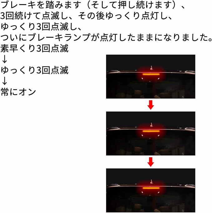 機能説明 :ブレーキを踏む(踏み続ける)、素早く3回連続で点滅します、次にライトをゆっくりと3回点滅させます、ついにブレーキランプが点灯したままになりました。