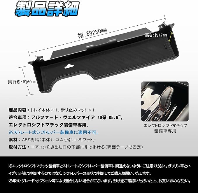 アルファード40系 センター エアコン吹き出し収納ケース ヴェルファイア40系 センターコンソルトレイ ALPHARD VELLFIRE コンソールトレイ ABS素材 ラバーマット付き 簡単取付 小物収納 内装 整理 便利パーツ アクセサリー インテリア ドレスアップ カスタム パーツ※エレクトロシフトマチック装備車専用