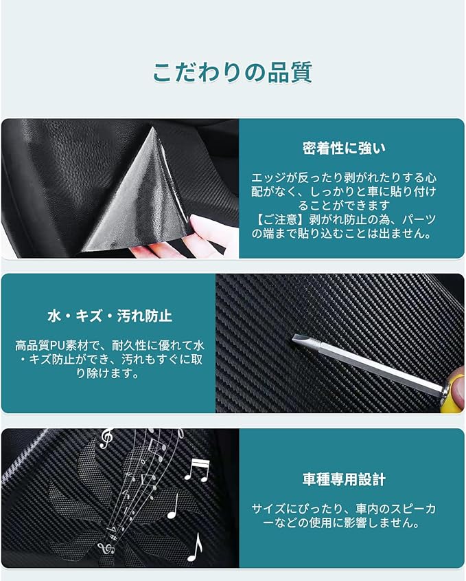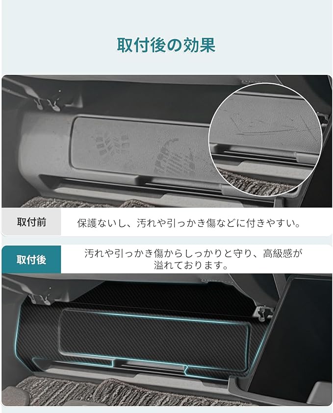 製品はHUAHAO製、車用カスタムの(フロントシート後方用)キックガードシートでございます。ご購入前、必ず車種をご確認ください。 車種専用:新型トヨタ アルファード/ヴェルファイア 40系 2023.6~スライドトレー式足元収納(フロントシート後方)専用 傷・汚れ防止・保護:乗降の時にフロントシート後方下部に足をぶつけたり、靴が当たったりしてしまい、車内の汚れや傷や擦れを、オシャレにカバー!フィット感はバッチリで、シートを貼ったようには見えず、最初からのデザインのように見えます。例えシートも既に擦り傷だらけになってしまっても現車損耗なくシートを張り替えればいい楽な作業です 車種専用デザイン:実車採寸で、オリジナル車種専用サイズで完璧にマッチし、ジャストフィット!! 高級作業:シートはよくある薄手の安価なタイプとは異なり高品質なエアレス加工済みのシートを採用しております 取付方法:1.設置前にグリース、ワックスまたは埃がないことを確認します。2.強い両面テープの粘着力で合わせて貼るだけ、すんなりきれいに貼る3.粘着テープをはがし、その位置に貼り付け、約1〜2分間押します。4. 貼り付け後、24時間以内に車を洗濯しないでください。※※ヒント:新車はカーワックスがあるため、両面テープでうまく貼り付けにくいです。設置前、対応の位置に付属のウェットティッシュやクリーニングクロスを使ってワックスを拭き取れてください。※※ ※弊社は真剣にご商品を検査してから出荷致すので、ご安心してお買い求めてください。商品不良率をゼロにすることができかねますので、万が一商品不具合のようでしたら、お気軽にご連絡くだ。弊社は24時間以内対応致します。※
