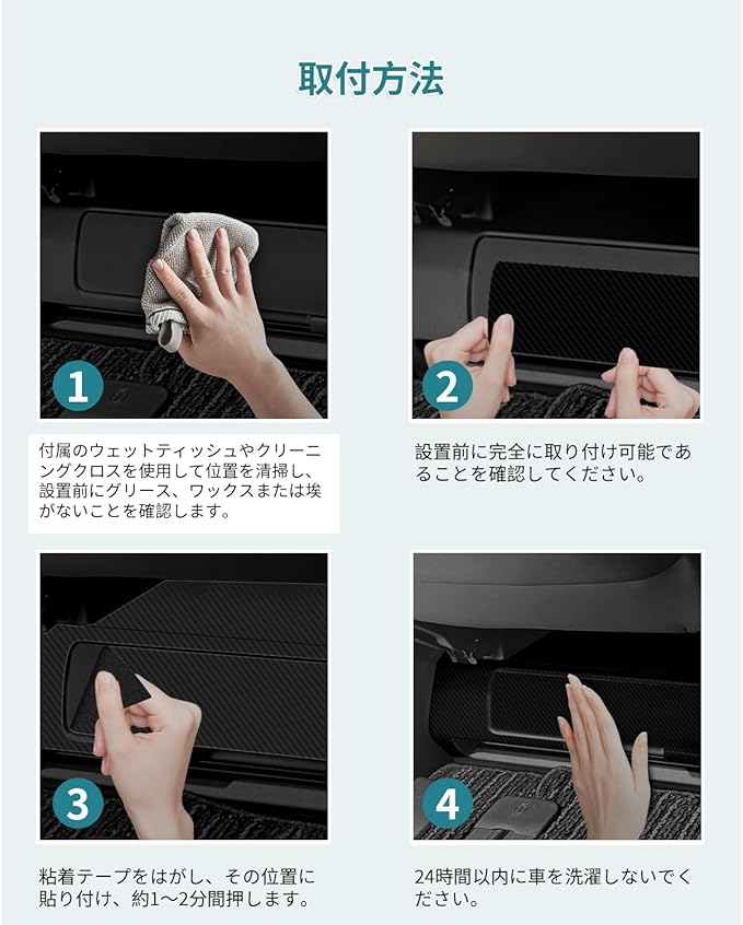【楽な装着作業】:強い両面テープの粘着力で合わせて貼るだけ、すんなりきれいに貼ることができます。※※ヒント:新車はカーワックスがあるため、両面テープでうまく貼り付けにくいです。設置前、対応の位置に付属のウェットティッシュやクリーニングクロスを使ってワックスを拭き取れてください。※※