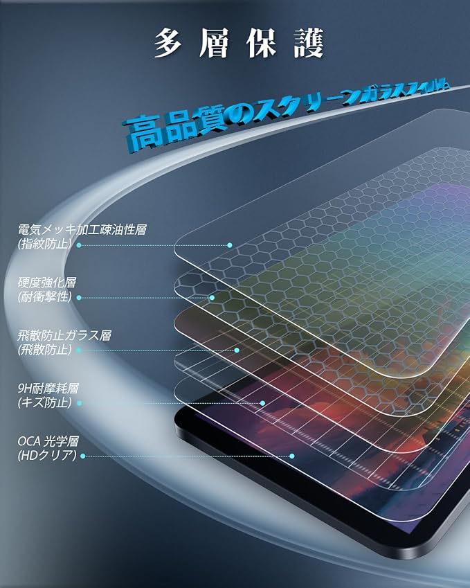 【優れた素材・多層保護】硬度9Hの素材を使用し、アークラウンドエッジ構造でお客様を守ります。多層保護層により傷防止、落下防止、耐摩耗性は優れ、さらに防爆層や防水層も搭載し安心です。HDクリア、99.9%の光透過率で指紋もほとんど残りません。強化ガラスが損傷した際も小さな破片がどこにでも飛散することはありません。