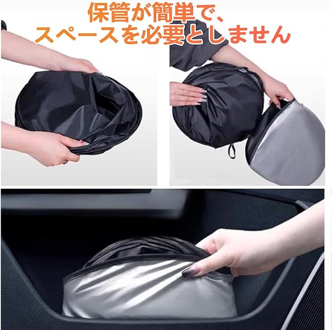 【収納可能】①シェードを2つに折りたたみます。②両端を持ち、8の字に曲げるようにひねります。③重ねるように折りたたみ、シェードについているバンドで巻きます。④はみ出した部分を整え、付属の収納袋で保管してください。