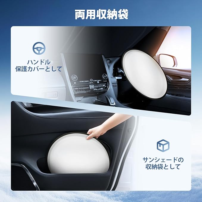 【多機能&プライバシー】:アルミ遮熱シートは眩しい光線を抑えることができます。車中泊や休憩時など、外からの視線が気になるときにも役立ち、プライバシーも保護できます。【ストラップ&収納袋付き】:本製品はストラップを設計し、収納する場合、ストラップで収納できます。また、収納袋も改良され、ハンドルカバーに置く可能です。ご注意:アルファードやハイエース専用のサンシェードは大きいですので、収納袋のサイズも少し大きいです。ごハンドルに装着する場合、ちょっと大きいかもしれません。ご了承ください。