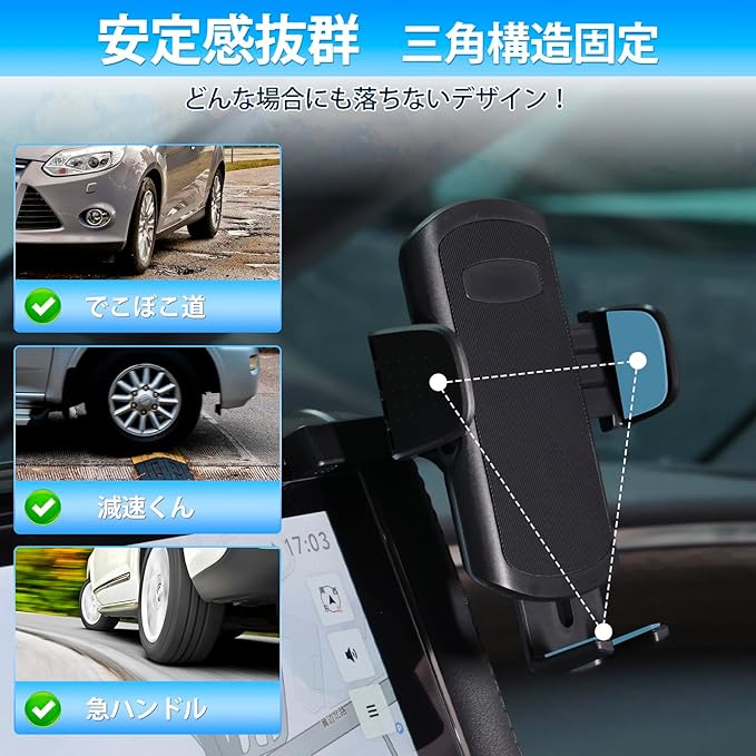 3.【安定感抜群!使いやすい】:スマートフォンをしっかりロックし、揺れても落ちないデザインを採用しています。それに、中心にボタンが配置されており、スマホをホルダーに置けて、軽く押すと自動ロックされるので、とても便利です。さらに、下支えが邪魔せず充電可能です。
